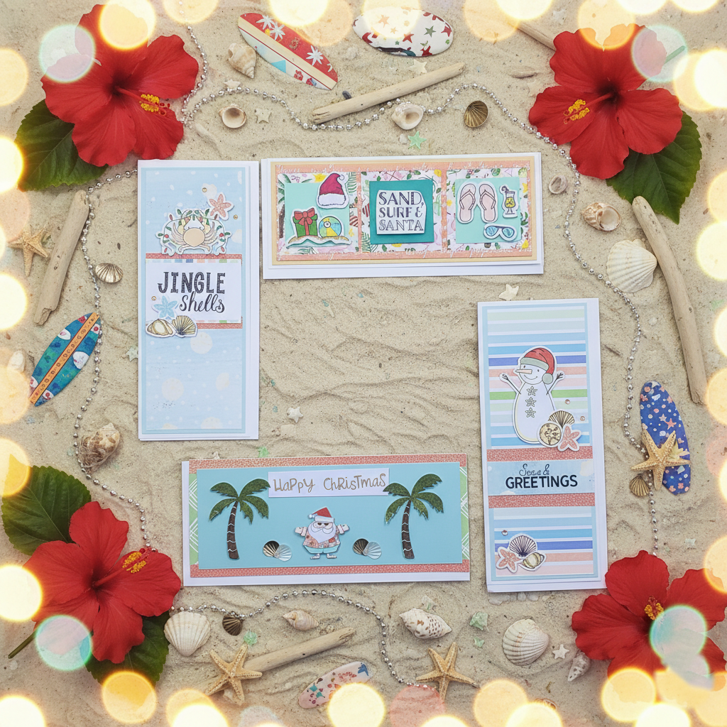 This 10 pack of handmade Summer Themed Christmas Cards consists of 4 slimline and 6 standard size cards. All come blank inside so that you can write your own personalised message.