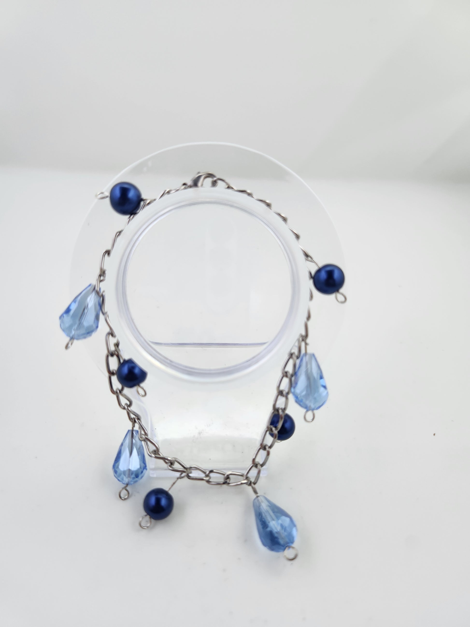 This silver chain bracelet has a mixture of light sapphire teardrop crystal beads and night blue pearls. There is a clasp at the top to make it easier to take on and off.