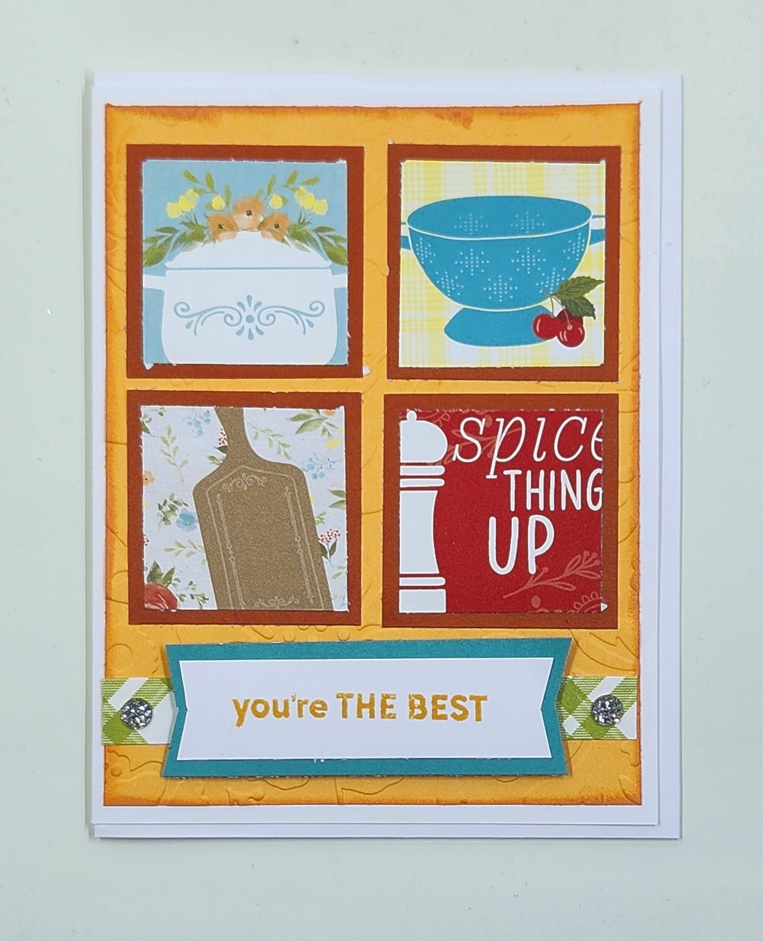 Made using cardstock and patterned paper. The sentiment is stamped and two gold glitter gems are added to either side of it to add that little bit of shimmer and sparkle.