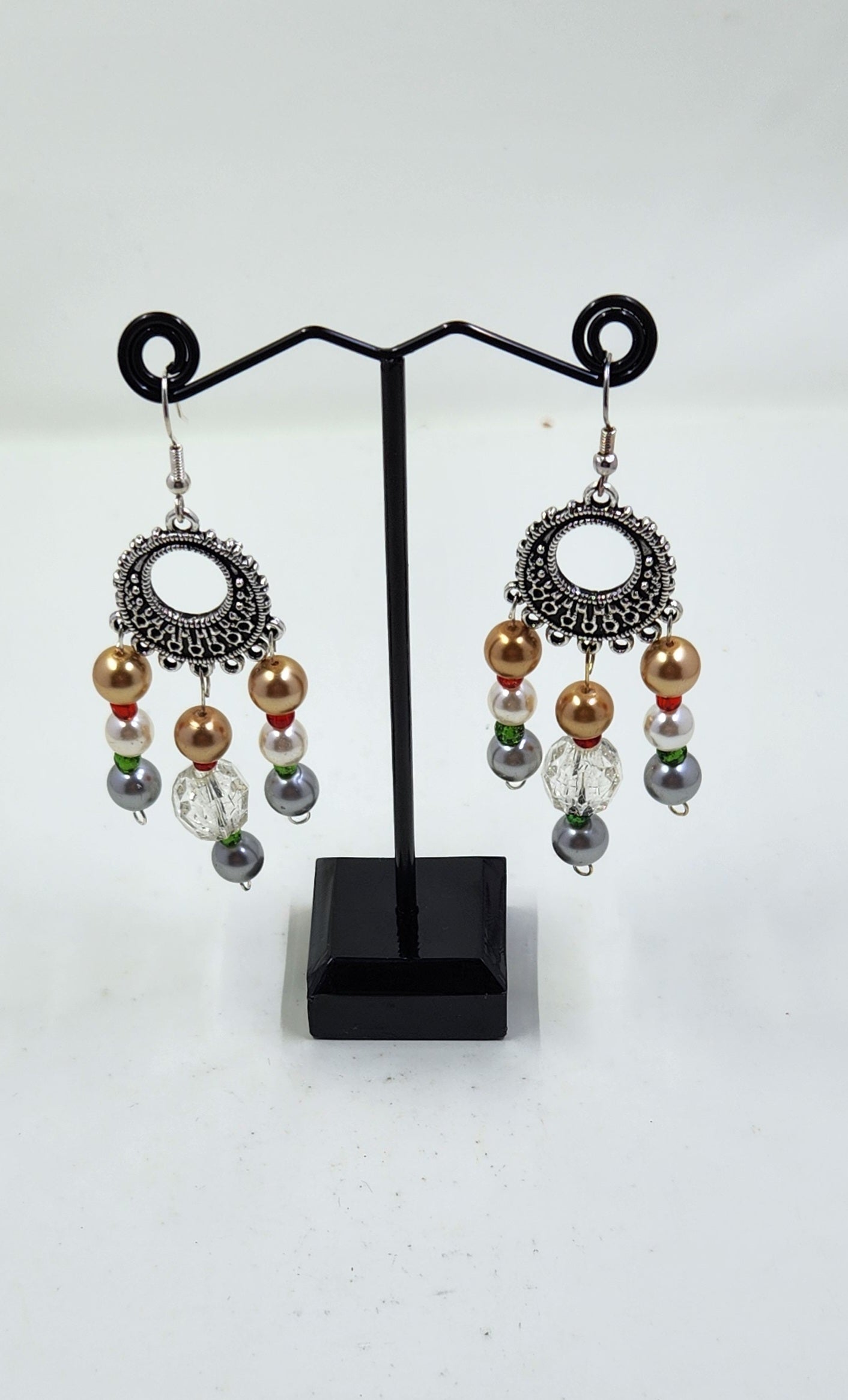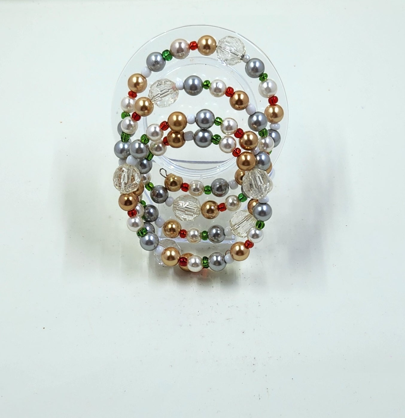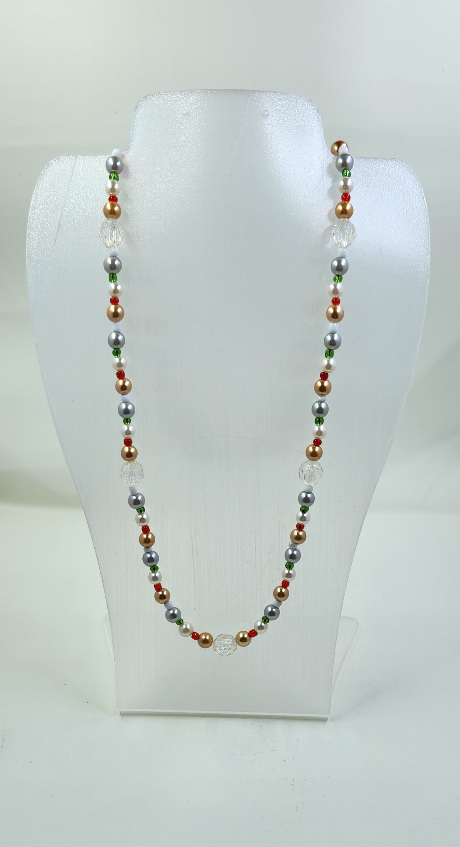 This handmade jewellery set contains a necklace, bracelet and earrings that have all been made with gold and silver pearls, red and green seed beads and clear crystal beads.