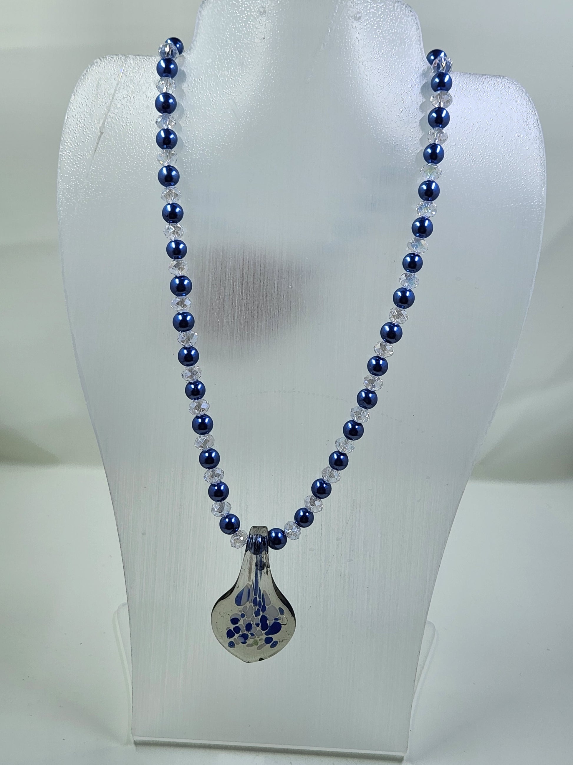This necklace has a grey with blue and white spots pendant in the center and then night blue pearls and clear crystal beads going up either side of the pendant.