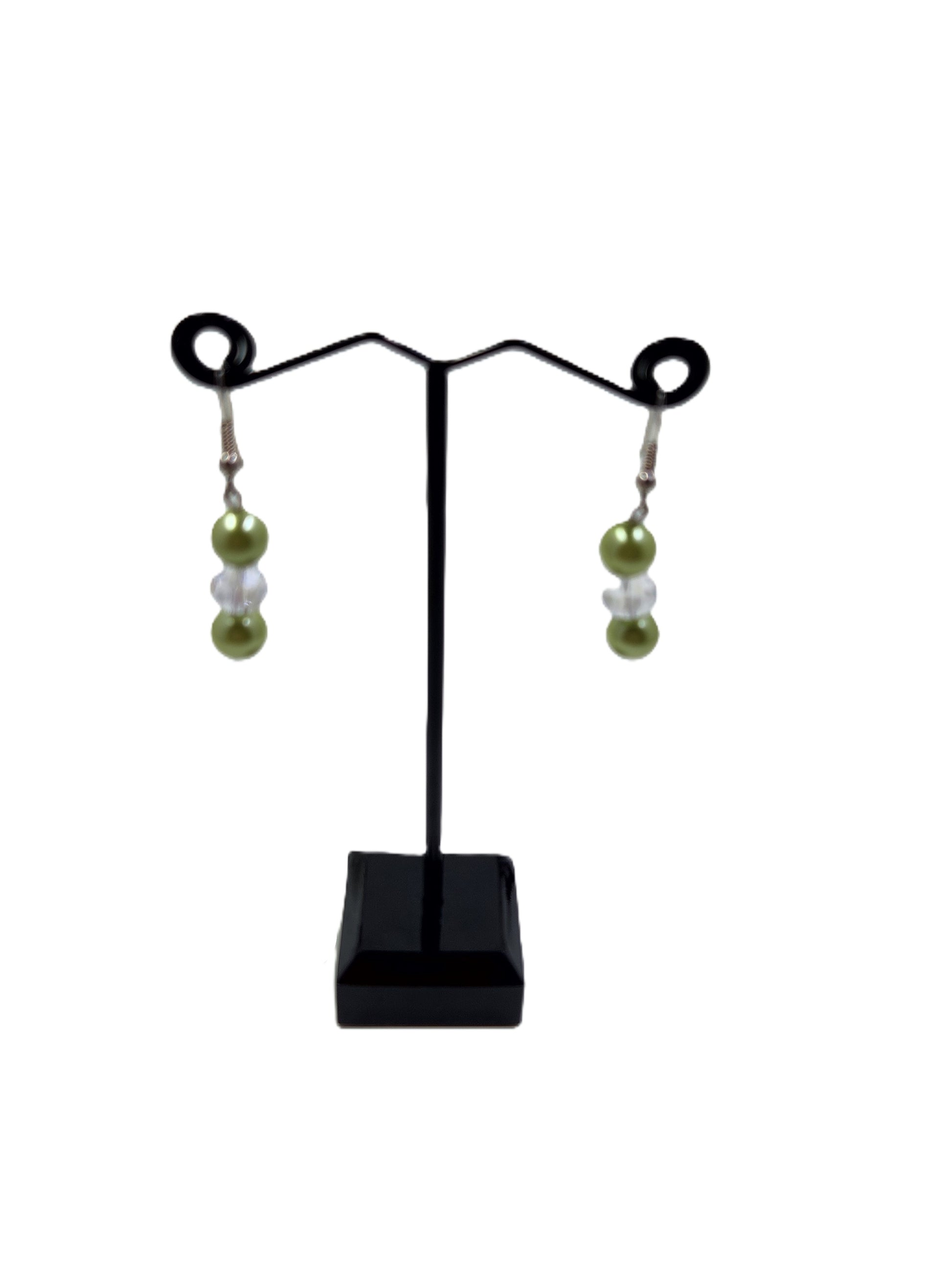 The necklace is made with a puffy heart flower pendant in the middle and light green pearls going up either side of it. The bracelet and earrings are made using light green pearls and clear crystal rondelle beads with the earrings having sterling silver findings. The necklace measures approximately 41cm but can be made shorter or longer.