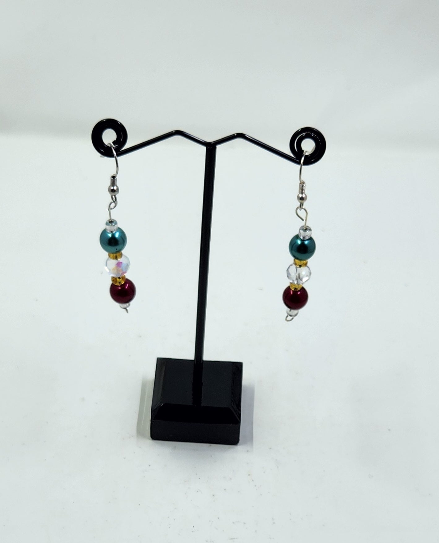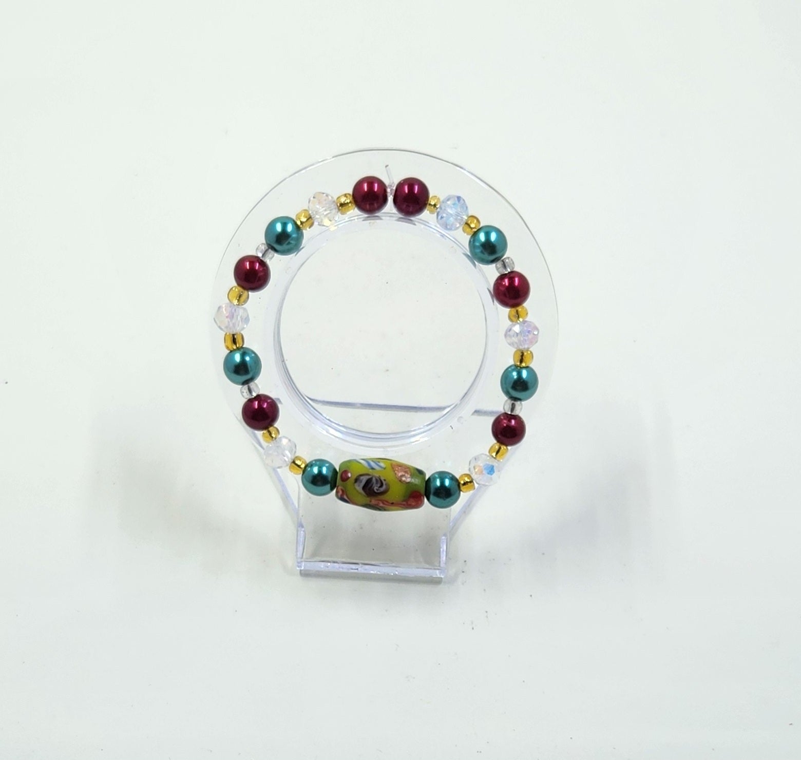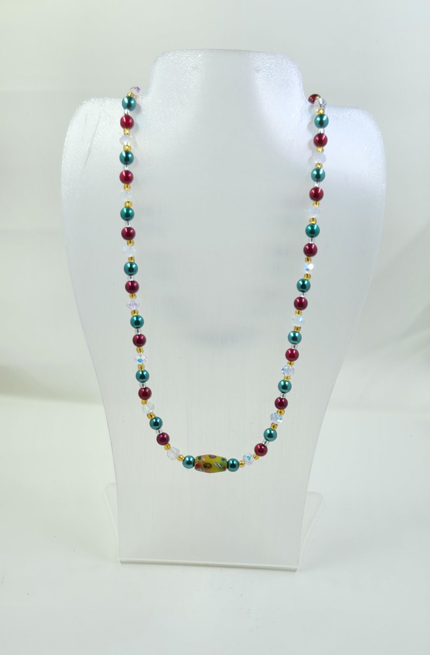 This handmade jewellery set includes a necklace, bracelet and earrings that consist of red and green pearls, gold seed beads and clear crystal rondelle beads. The necklace and bracelet have a long green glass bead that has hints of red, blue and white in it.
