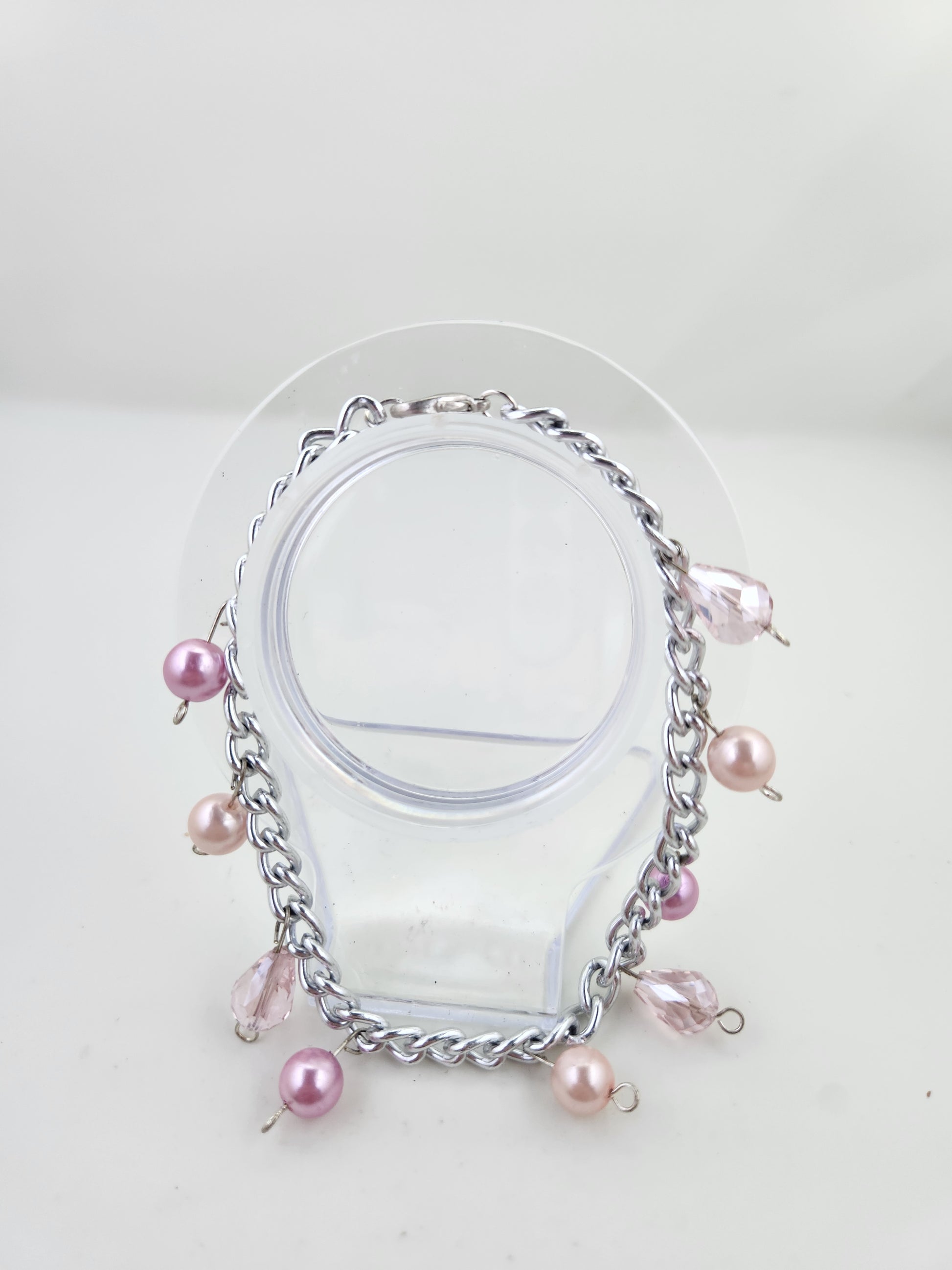 This silver chain bracelet has light pink and hot pink pearls and light pink crystal teardrop beads with a clasp at the top making it easier to put on and off.