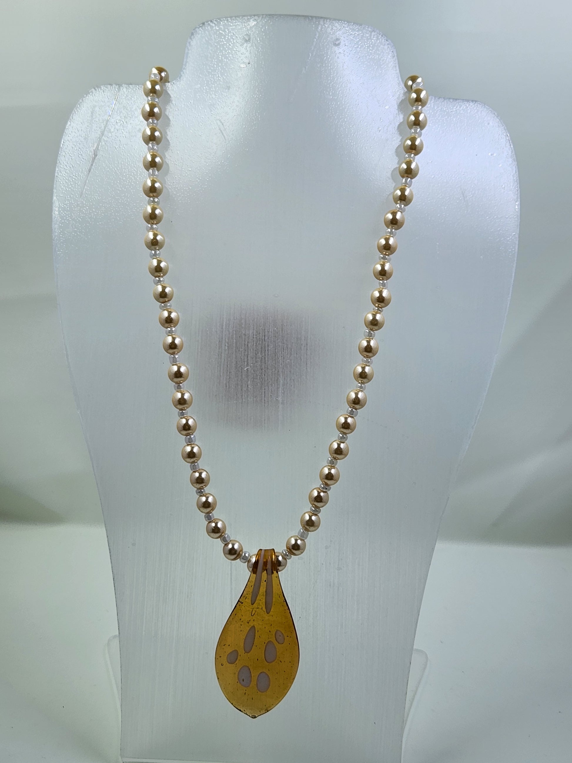 This necklace has a yellow drop with white spots pendant in the center and then yellow pearls and white seed beads in between each pearl going up either side of the pendant. Measuring at approx. 41cm long, it can be made shorter or longer if you prefer.