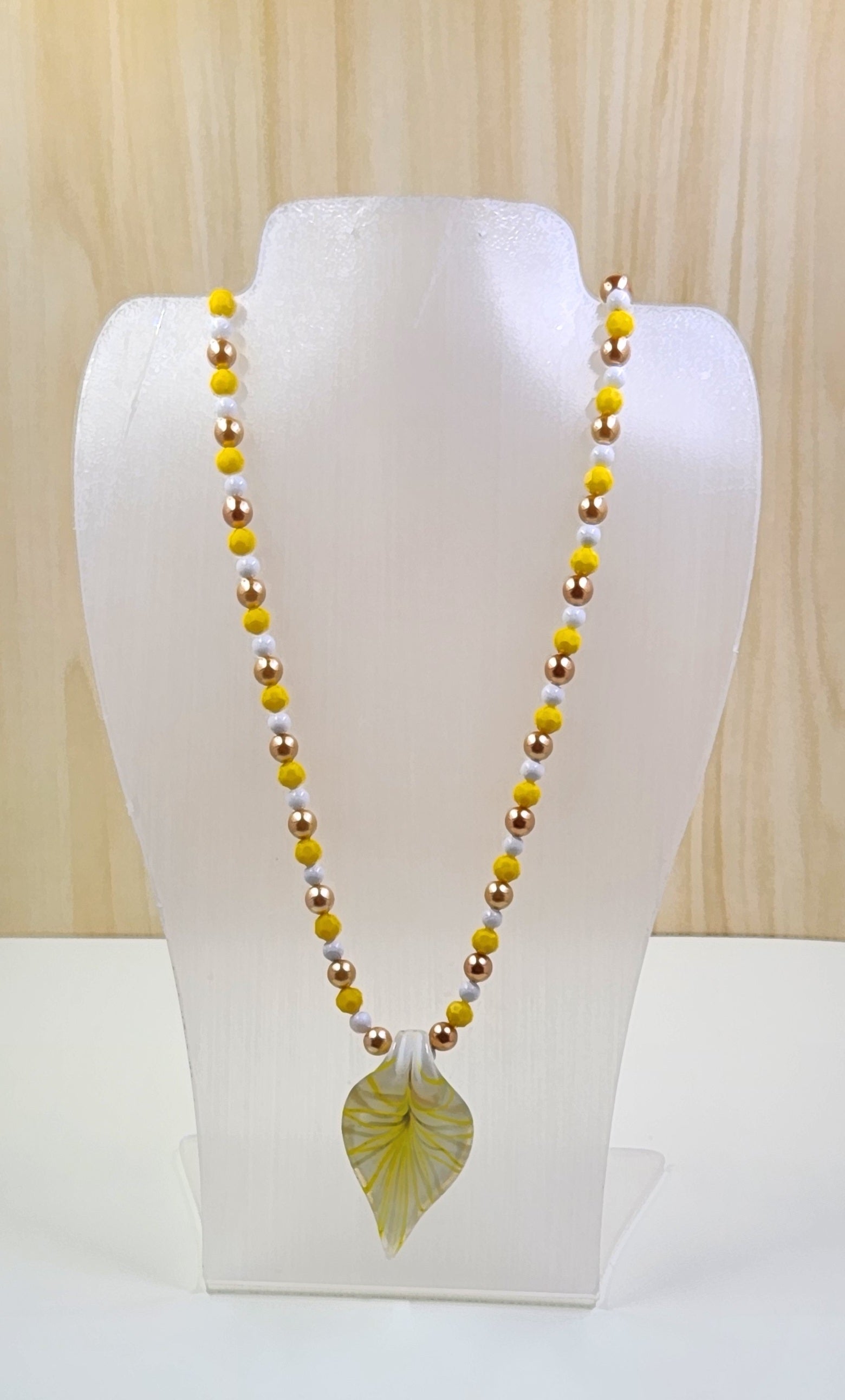 This necklace made from Tiger Tail wire has a white leaf pendant with yellow and gold accents in the centre. Going up each side of the pendant are yellow crystal rondelle beads, white round glass beads and gold pearls.