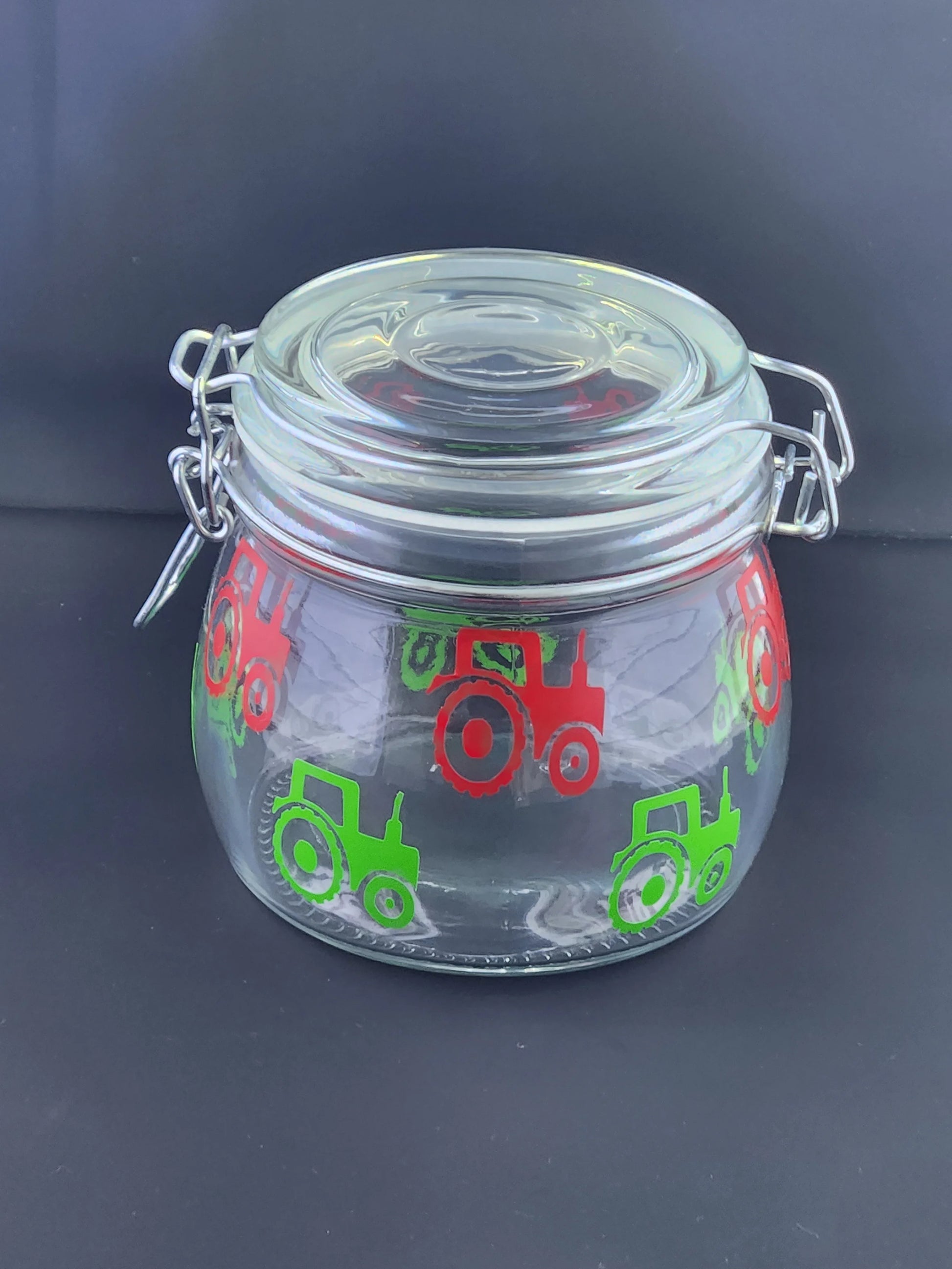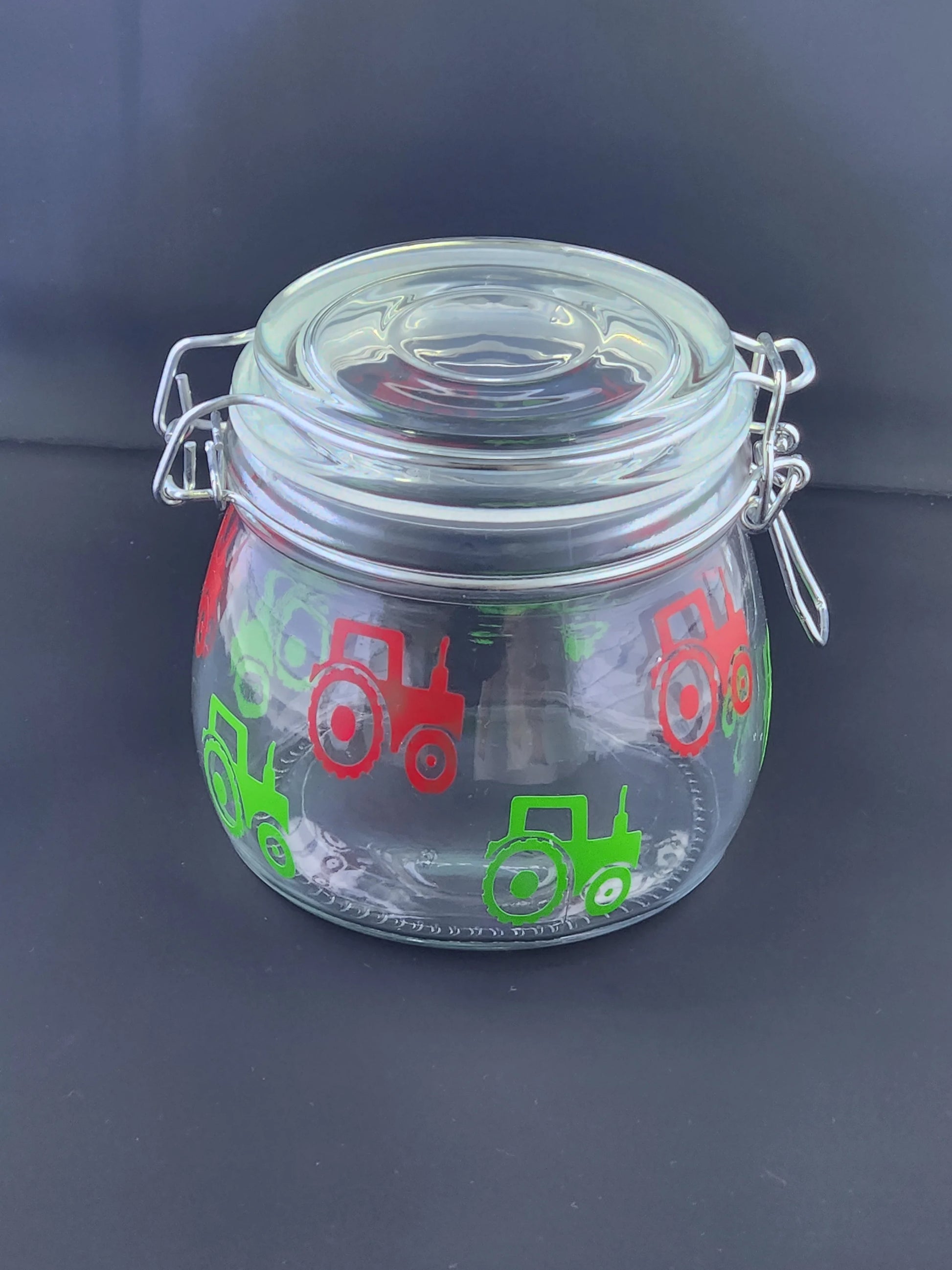 This flip top jar is covered with red and green permanent vinyl tractors making it dishwasher safe and giving a crisp clean lasting finish.