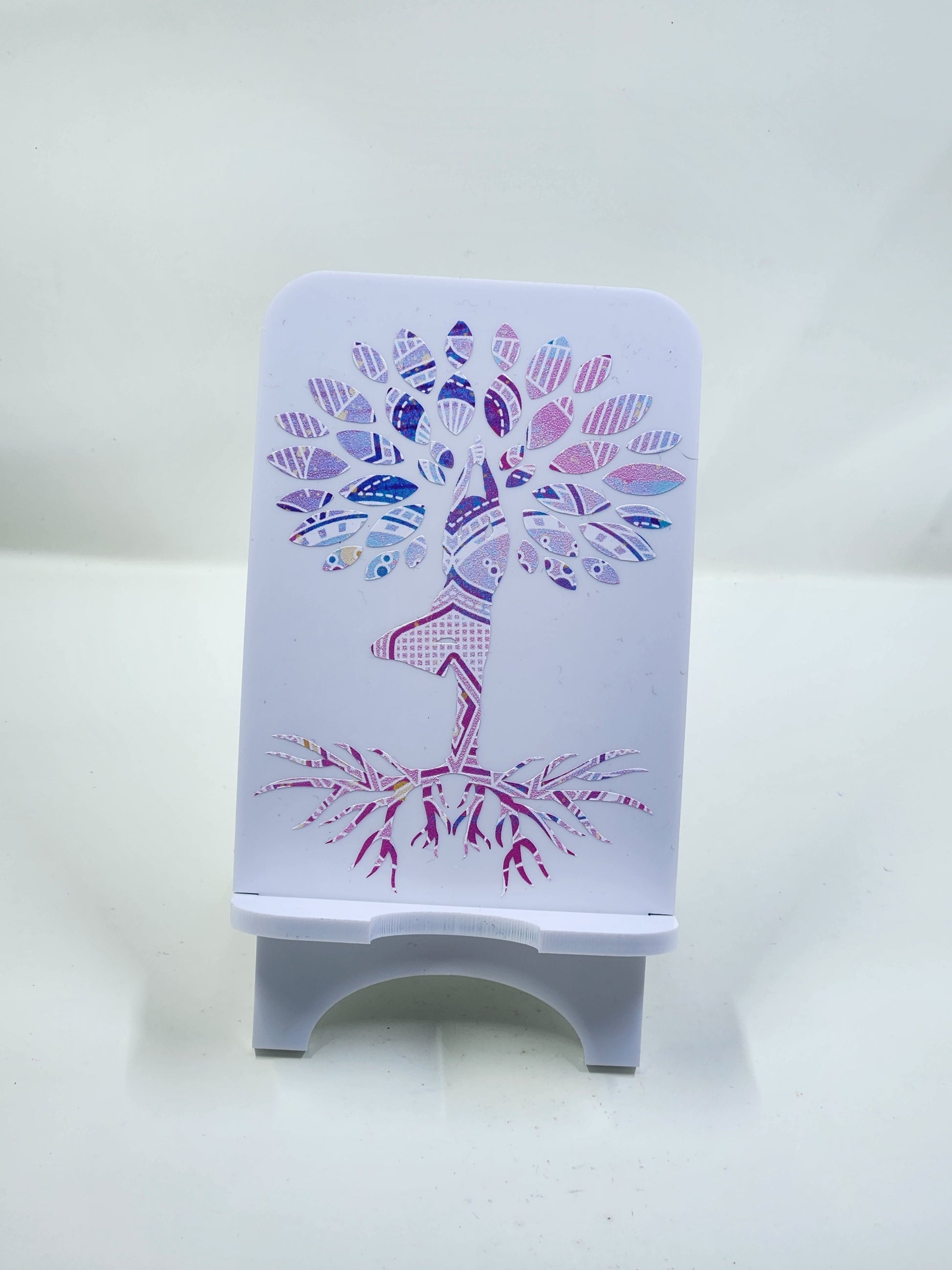 This acrylic phone stand has a tree with a person standing in the middle doing a yoga. The roots of the tree could represent them grounding themselves while the leaves and branches of the tree is them growing tall.